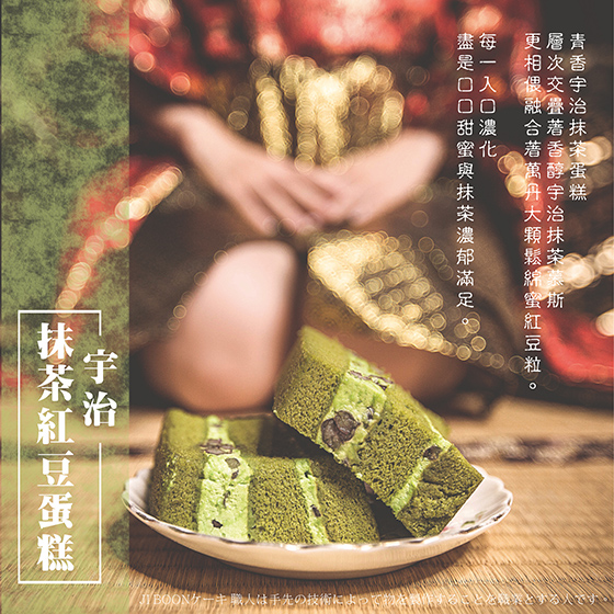 青香宇治抹茶蛋糕,層次交疊著香醇宇治抹茶慕斯更相偎融合著萬丹大顆鬆綿蜜紅豆粒!每一入口濃化,盡是口口甜蜜與抹茶濃郁滿足